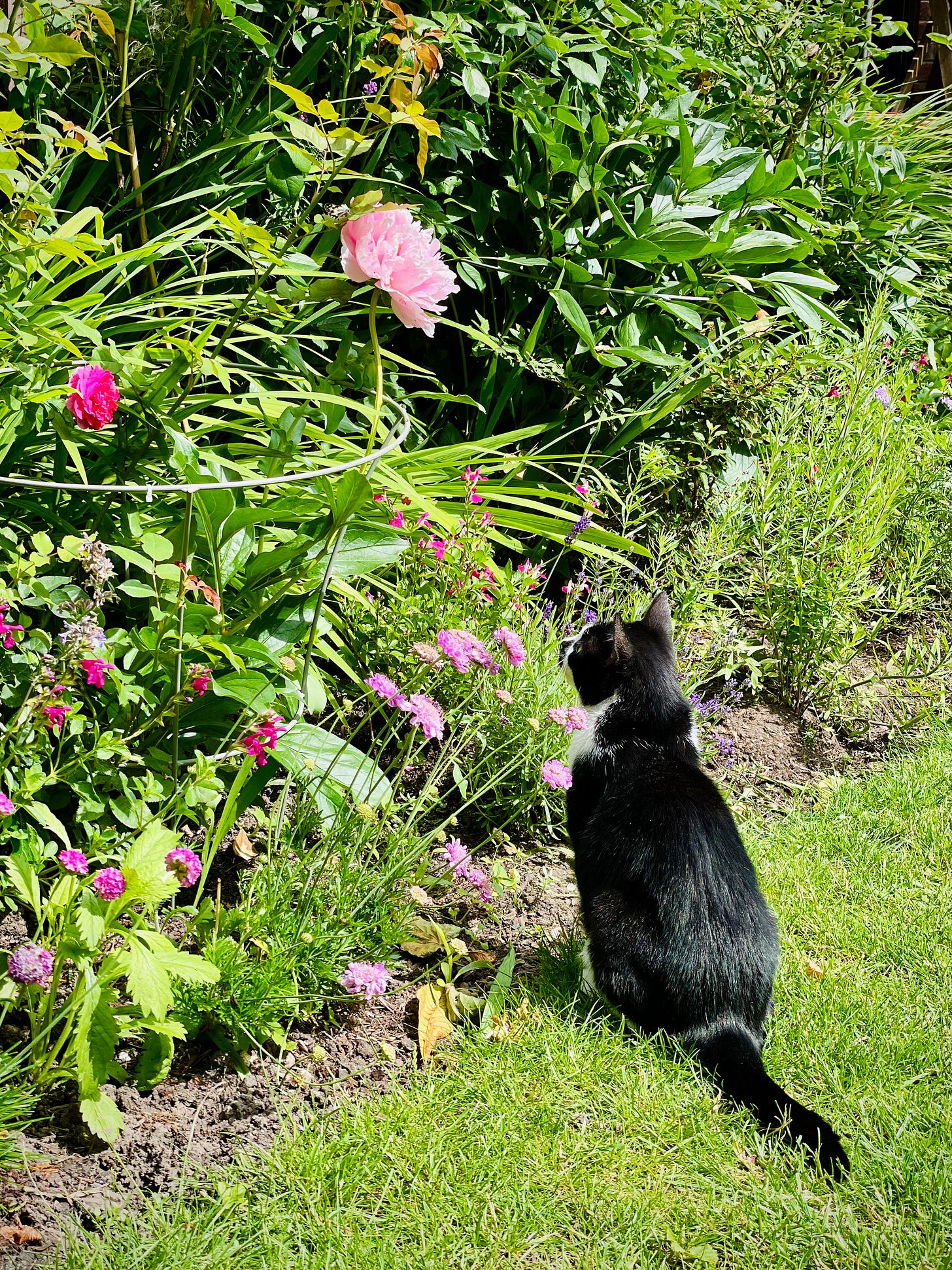 Aw, just look at that cat, appreciating the last Sarah Bernhardt. Or is she? If you look closely, there’s a yellow and black striped butterfly sitting on the peony. A really lovely one, with beautiful, delicate pointed wings. Mimi-the-cat was entranced. How sweet, I thought, before she executed a midair jump and backflip, leapt across the grass…