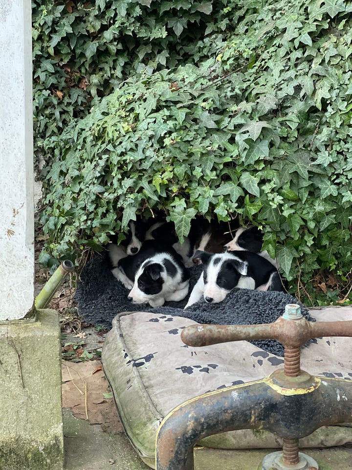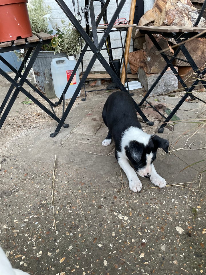 One pup leaves the hideaway, and walks up to us. She sniffs my hand, accepts lavish strokes, and promptly climbs into my lap. She reaches her little miniature collie face up, and starts to lick my face. (I don’t mind dogs doing this, but understand that some people do mind.) I kiss her back on the nose. She curls in my lap, ecstatic as I scratch behind her ears, leaning up for more kisses. ‘Uh-oh’, I think. My heart feels quite considerably lighter. I look at her carefully. It is hard to tell a litter of largely black and white pups apart, but she is a girl, and she does look a little smaller than the others. I am almost certain she is Gertie, the pup still looking for a home. Something in my chest feels funny, and all the sensible things - our lack of time, energy, resources - fly out of the window. She is truly joyous. And then - the farmer walks by. ‘Is this Gertie?’, I call out, hoping so much that she is. ‘She is!’, he says. And my heart leaps. But he continues: ‘And a lady from Somerset is coming to take her tomorrow!’