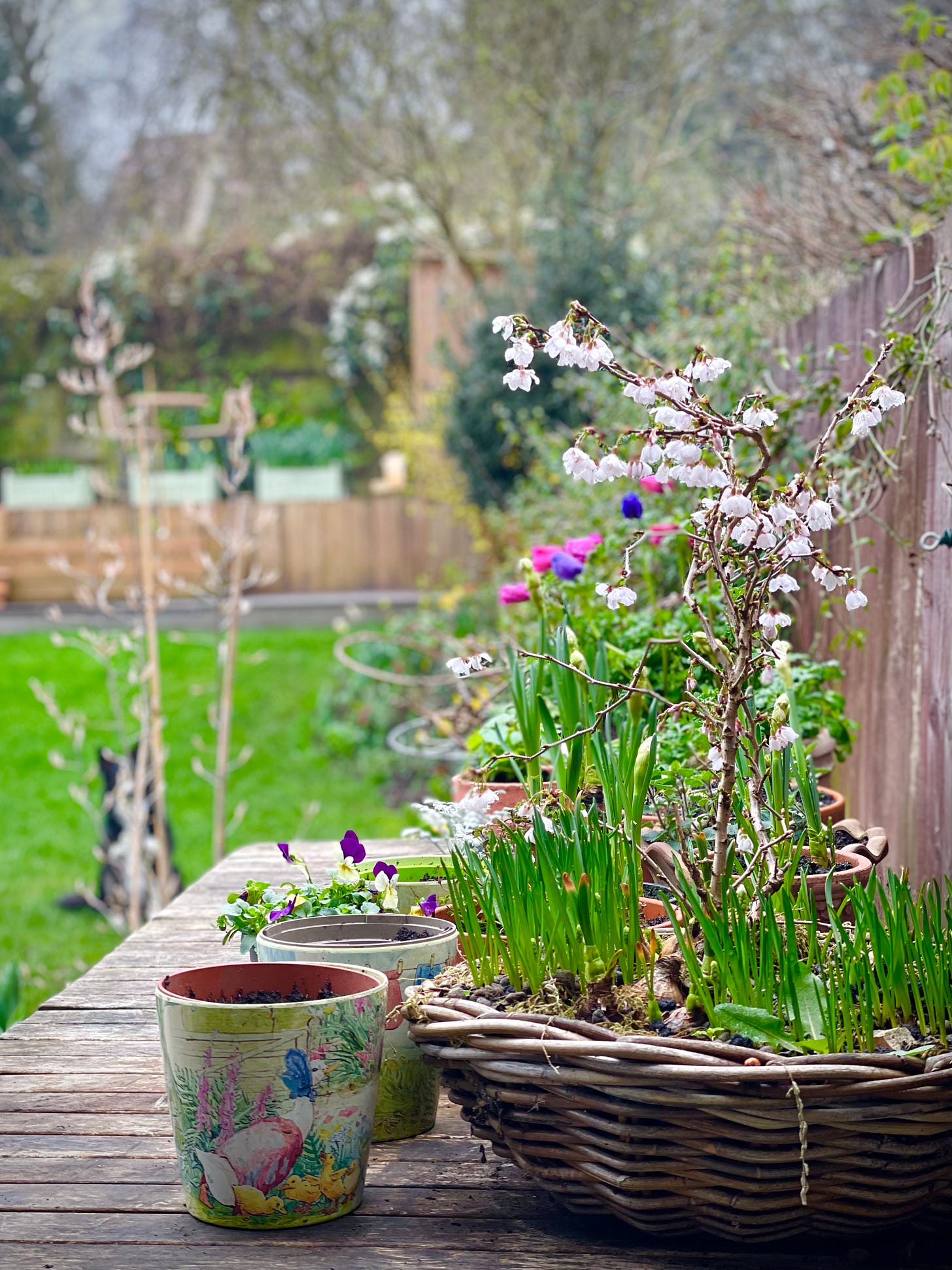 made a spring-ish display table (the Beatrix Potter containers are an ongoing pea-growing competition - so far Mia is winning. But I did have to rescue all the dried peas and re-plant them because the children drowned each pot in water as soon as I turned my back)