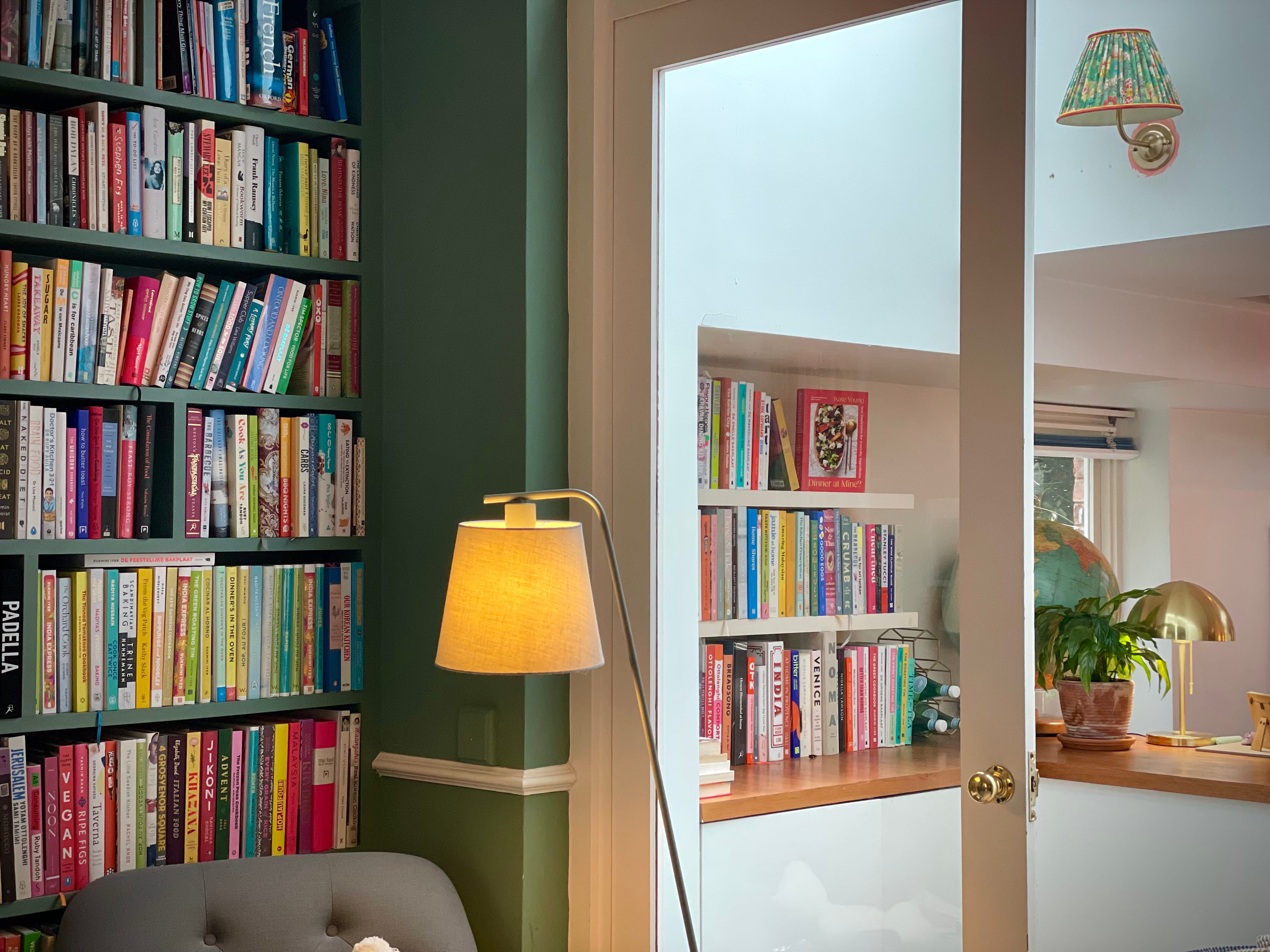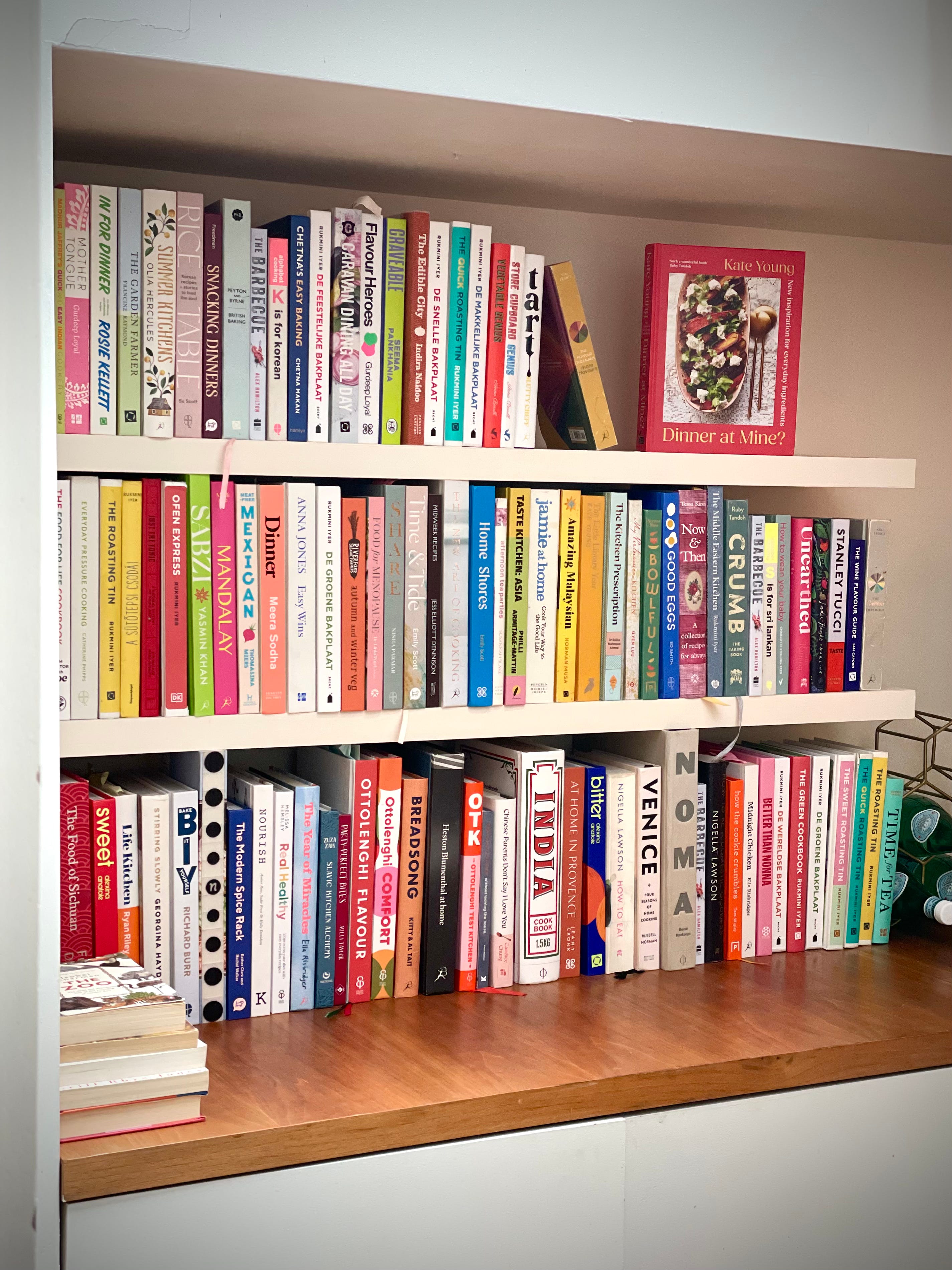 cleared a unit in the kitchen which has in various incarnations been a bar and a baby-changing area, put up shelves, painted them in Dimity, and turned them into a cookbook-overflow shelf: