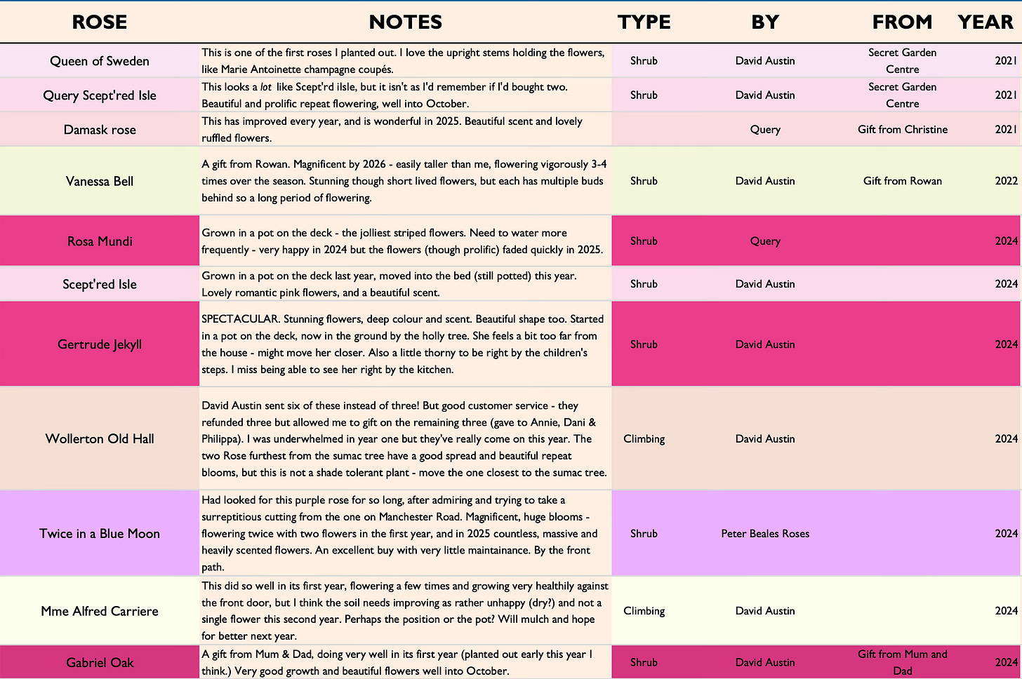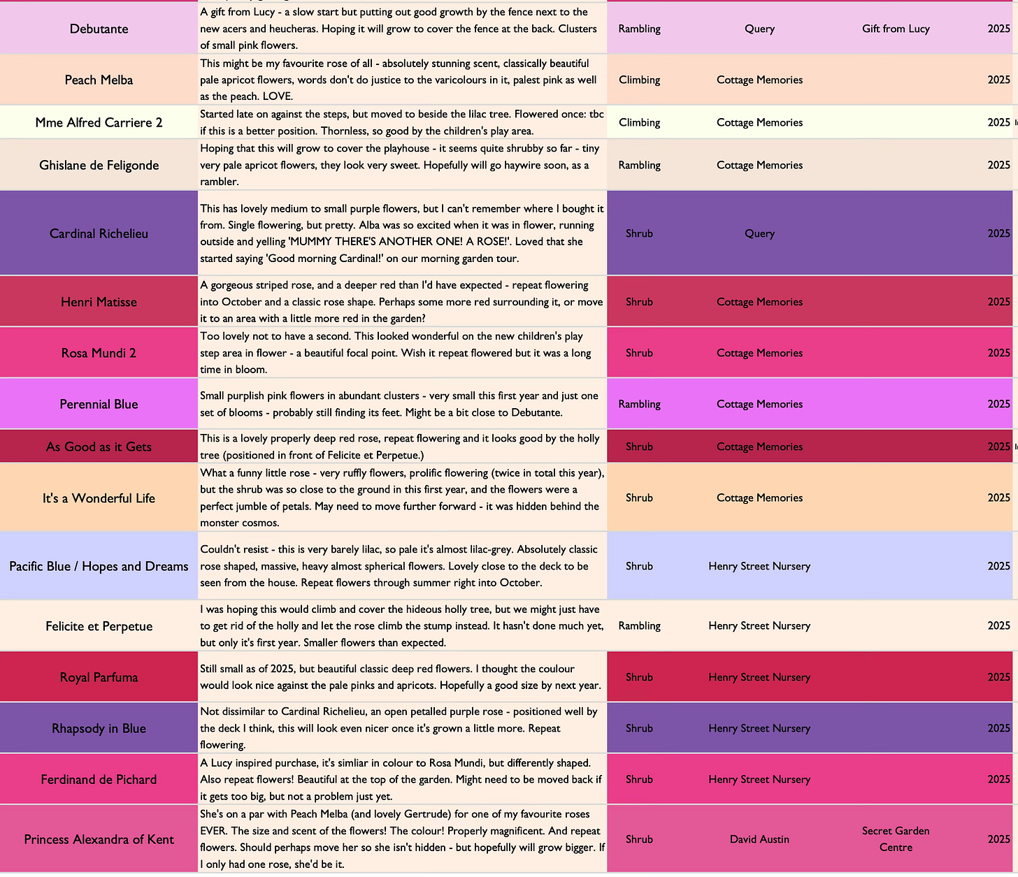 This is how things started out, before 2025. I do not expect you to read my frankly pedestrian notes, as they were just for me, but it gives you an idea. (In case you do zoom in, I have deleted the excessively repetitive ‘stunning’ ‘love love love’ ‘glorious’ etc. There are only so many words one can use - a rose is a rose is a rose, etc.)